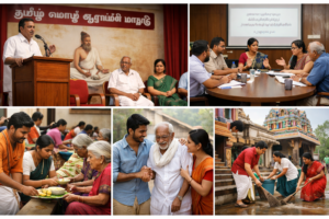 12. தமிழ் மொழி வளர்ச்சிக்காக குழுக் கூட்டங்கள். மீட்டிங். செமினார், சிம்போஸியம் (ஆராய்ச்சிக் கூட்டங்கள்). சொற்பொழிவு முதலியன நடத்துதல் பாரம்பரிய வளர்ச்சி. சமுதாய பழக்க வழக்கங்களோடு ஒருமித்து, நம்பிக்கைகளை ஒழித்தல் முதலியவற்றிற்கு ஏற்பாடு செய்தல், கோவில்களில் உழவார திருப்பணி செய்தல்.